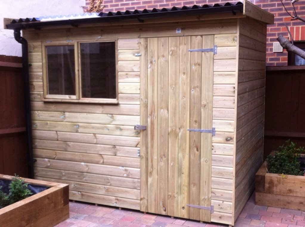 The Reverse Essex Pent garden shed is made from high quality Red Wood Tongue and Groove cladding. Standard framing are 47mm x 35mm planed battens with diagonal supports for strength and stability, The roof and floor are made from 12mm T&G boarding which gives strength and durability. The floor has runners (50mm x 25mm Pressure Treated battens) spaced approximately 1' apart to give adequate air flow. The Roof has main and Intermediate beams for roof strength and is overlayed with a good quality green mineral felt.